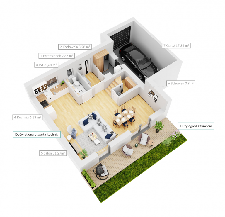 Do wszystkich domów przylega taras oraz ogródek, czyli miejsce doskonałe do relaksu na świeżym powietrzu, zabaw z dziećmi lub spędzania ciepłych wieczorów pod rozgwieżdżonym niebem.